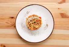 240 г • основа для пиццы, ветчина, томат свежий, маслины, шампиньоны, петрушка, руккола, масло красное