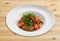 380 г • креветка салатная, капуста пекинская, лапша рисовая, цуккини, морковь, лук репчатый, фасоль стручковая,фирменная заправка