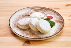 200г • творог, мука пшеничная в/с, яйцо куриное, подаются со сметаной и сахарной пудрой