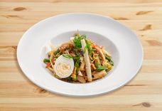 380 г • куриное филе, капуста пекинская, лапша яичная, цуккини, морковь, лук репчатый, фасоль стручковая, яйцо куриное, фирменная заправка
