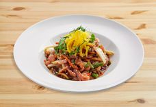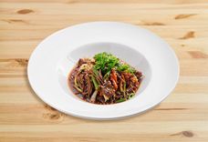 380 г • говядина вырезка, капуста пекинская, лапша гречневая, цуккини, морковь, лук репчатый, лук порей, фирменная заправка