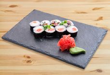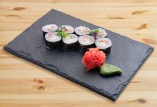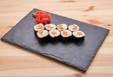 230 г • лосось филе с/с, сыр сливочный, рис для суши, огурец свежий, стружка тунца, нори