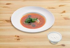 350/100 г • кефир, свекла, огурец свежий, сметана, яйцо куриное, лук зеленый, укроп, подается с картрфепем фри